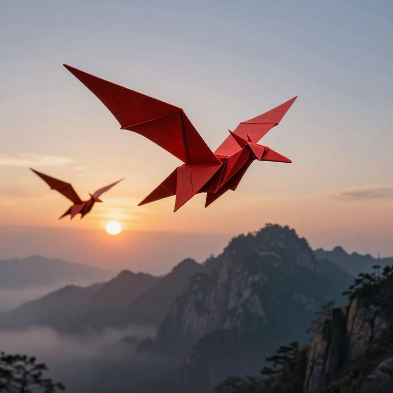 Origami dragons soar gracefully against a twilight sky, their crimson wings reflecting the golden hues of the setting sun as they glide over a majestic mountain range cloaked in mist and mystery.