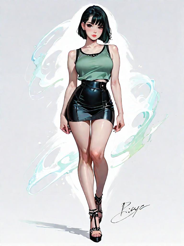1girl, source_comics, realistic face, full body shot, Woman, casual everyday, mint green cable knit sweater, crew neck, long sleeves with ribbed cuffs, tucked into a mid-rise denim A-line skirt with buttons down the front, knee-length, bare legs, no visible jewelry, neutral makeup, hair down with soft waves, plain gray background.