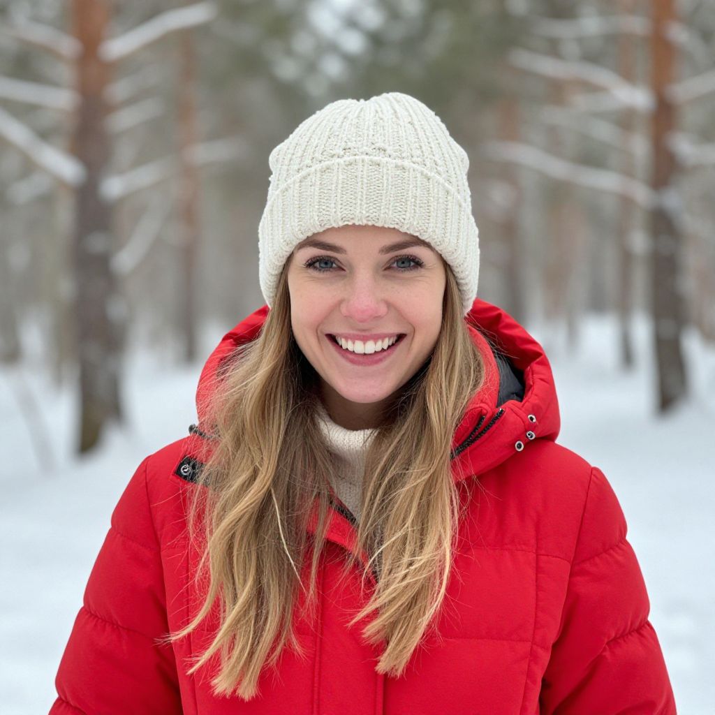 Photograph of a smiling young woman with light brown hair, wearing a white knit hat, red winter jacket, and beige scarf, standing in a snowy