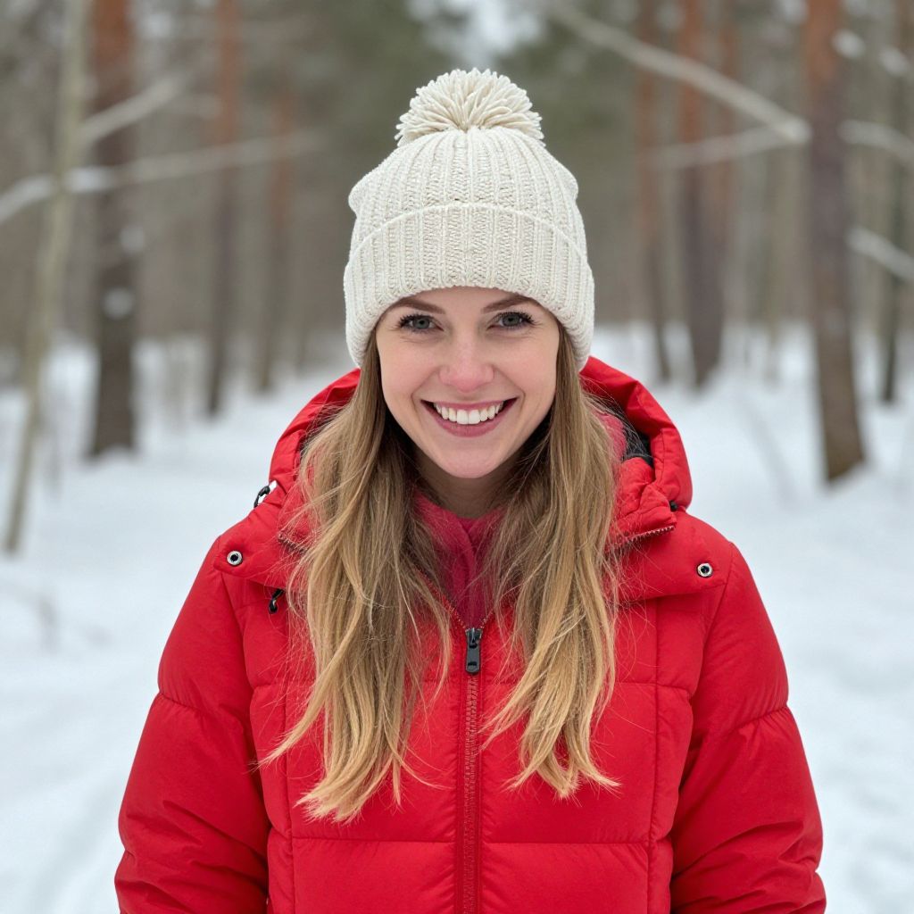Smiling woman bundled in a red puffer jacket and cream knit hat stands joyfully amidst a snowy forest, her long golden hair cascading over her shoulders as she beams warmly at the camera.