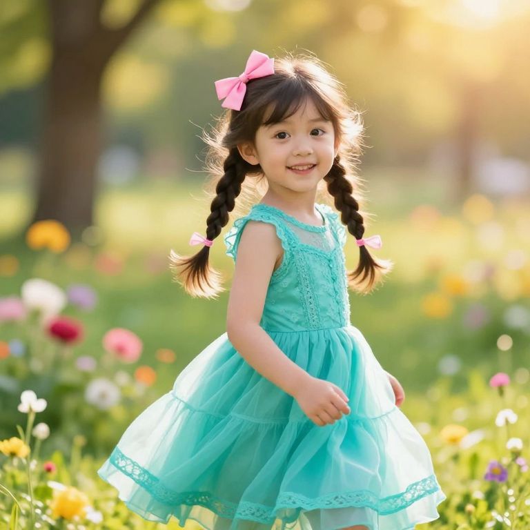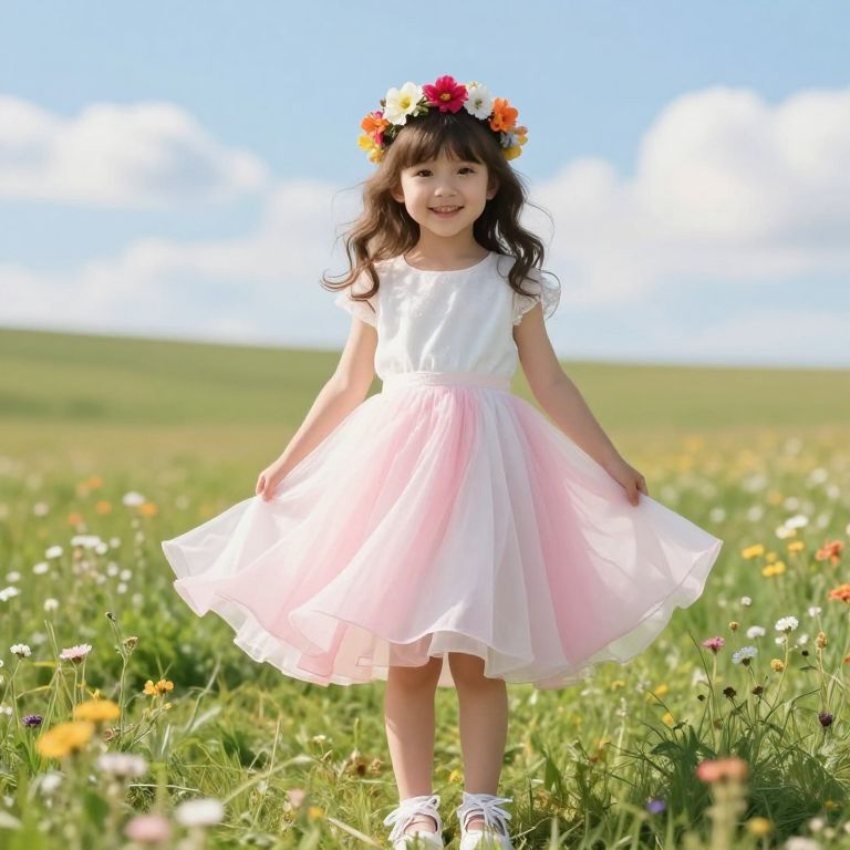 A beautiful young girl stands in a sunny meadow, wearing a vibrant yellow dress that flows gently in the breeze. She wears a wide, floral hat on her head, adding a cheerful and whimsical touch to her look. Her feet are covered in light, comfortable sandals with a delicate lace detail. She has long, wavy hair that falls just past her shoulders, and her bright, curious eyes gaze softly into the distance, as if enjoying the peaceful scenery. The background features a soft gradient of green and blue, with blooming flowers and a few trees in the distance, creating a warm and inviting atmosphere.