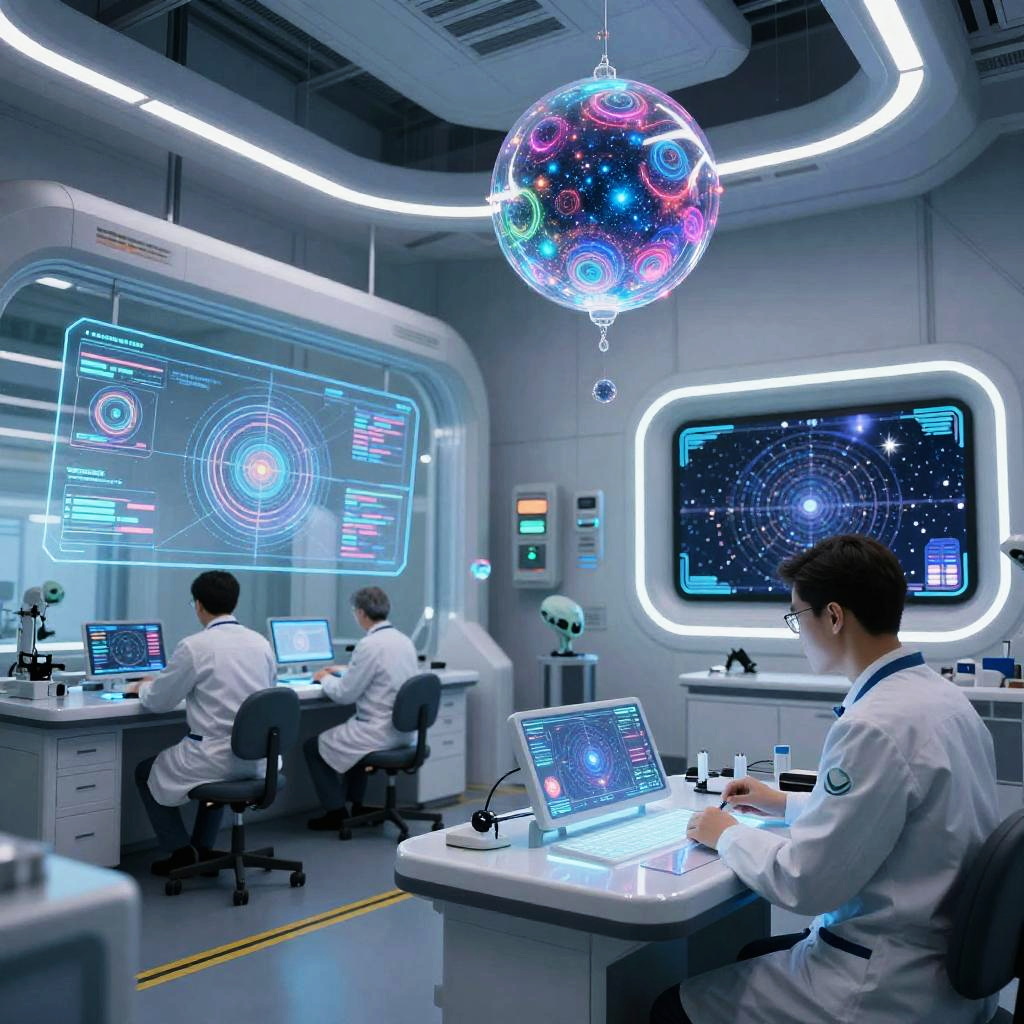 Arcturiano scene showing advanced technology labs with holographic displays and floating energy spheres, alien scientists studying star maps, futuristic and sleek interior design with neon lights.