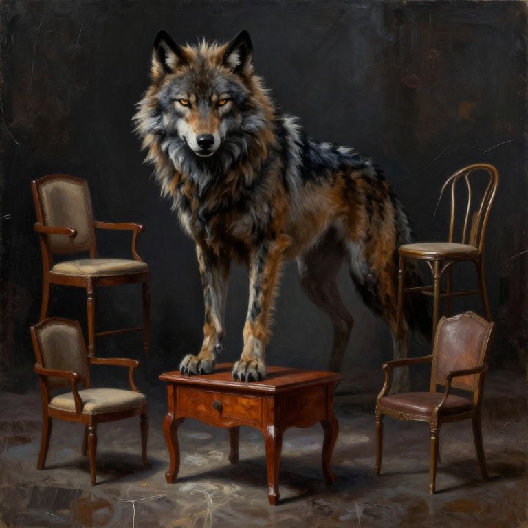 Furniture Arrangement a feline version of a werewolf. dramatic painting, oil painting, digital painting,