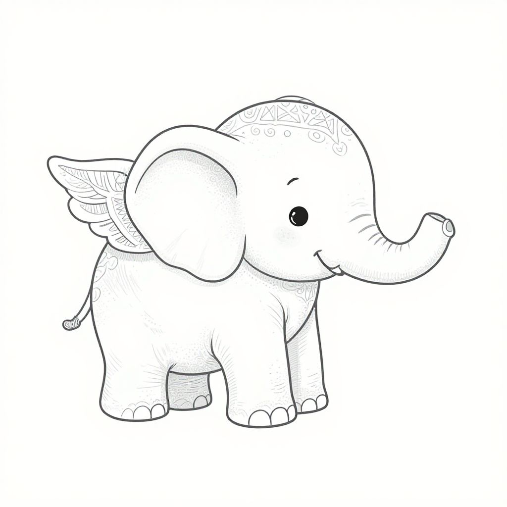 Cute animal line art depicting a chubby baby elephant with tiny wings, intricate patterns on its body, delicate thin lined texture, gentle curves, imaginative and dreamy composition, perfect for a children's book illustration.