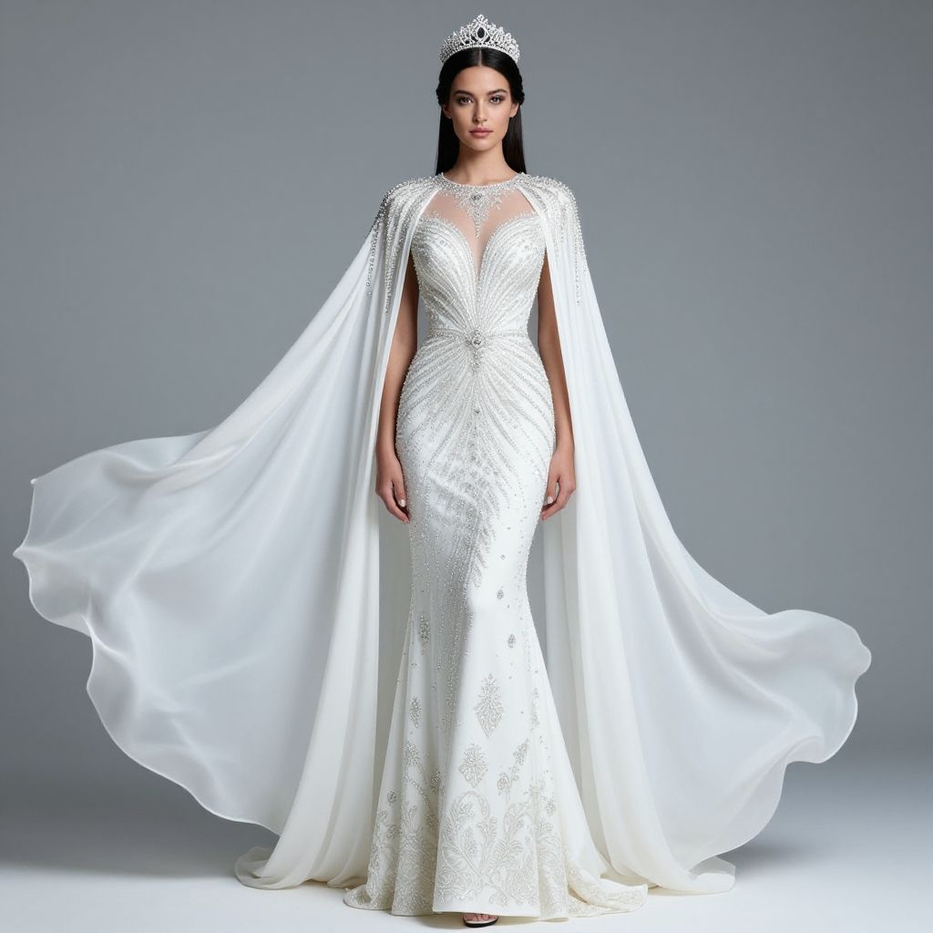 This stunning image features a woman in an elegant, high-fashion white gown adorned with intricate silver embellishments. The dramatic design is complemented by a flowing cape and a tiara, exuding a sense of regal sophistication and timeless beauty.