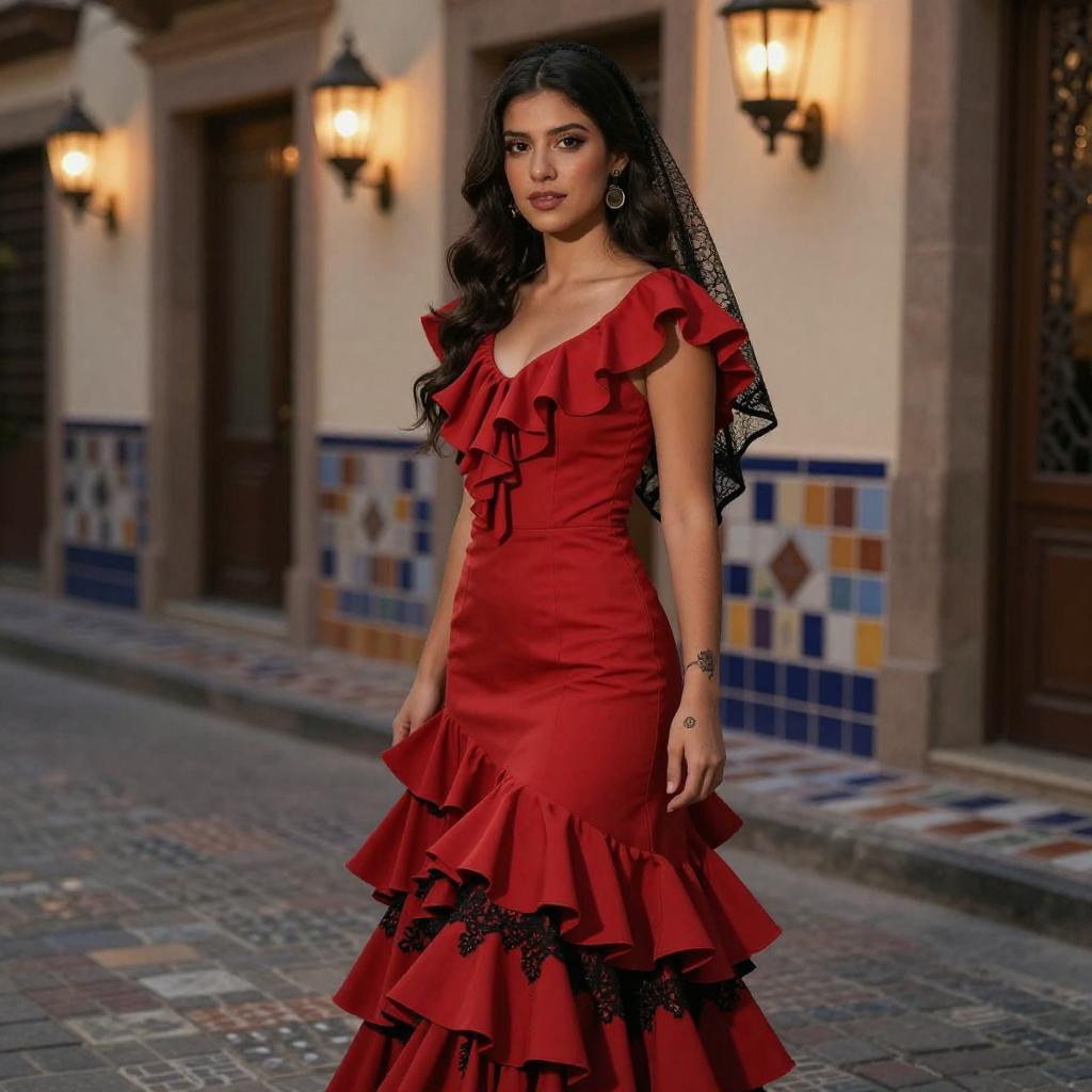 An artistic portrayal of a young Latina woman with long dark wavy hair, sun-kissed skin, expressive dark eyes and a small rose tattoo on her wrist, poised and confident expression dressed in a voluminous crimson flamenco gown with layered ruffles, off-shoulder fitted bodice, a high-low hem revealing an embroidered black lace underskirt, and a delicate black mantilla pinned at the back, standing on a cobblestone street lined with colorful Spanish tiles and glowing lanterns, rendered in a hyperreal cinematic film still with shallow depth of field, dramatic low-key lighting, rich color grading, and subtle film grain.