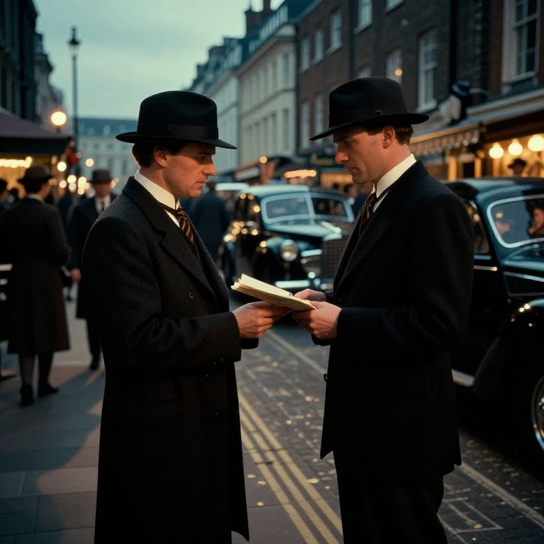 MI6 classic espionage scene featuring a mysterious agent exchanging secret documents in a bustling London street market, vintage cars and period architecture, dusk lighting casting long shadows, film noir style with rich color grading and intricate detail