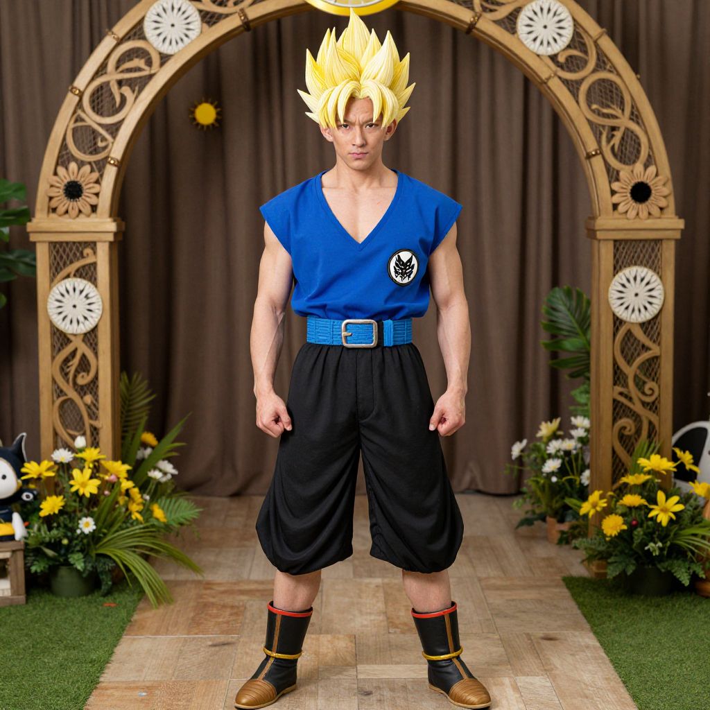 Trunks Dbz Costume, man in a blue shirt and black shorts standing in front of a decorated archway