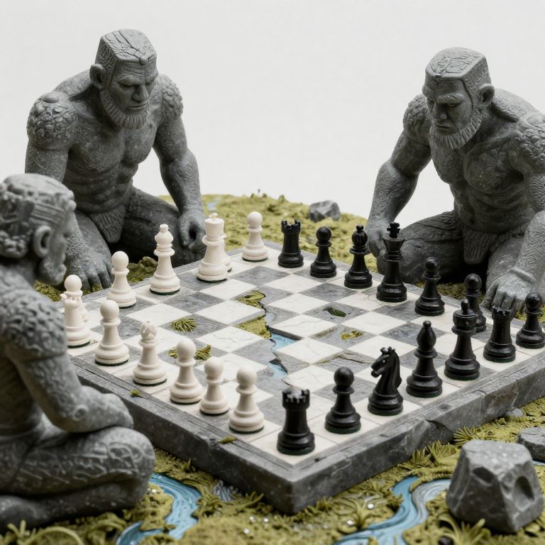 A chess match is played between stone giants, where each move reshapes valleys, rivers, and entire civilizations.