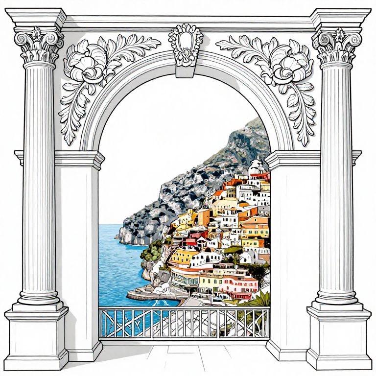 This digital drawing features an intricately detailed, white, classical stone arch with floral carvings at the top and sides, framing a colorful coastal town. The town, nestled on a hillside, showcases a mix of pastel-colored buildings, including yellow, orange, and white structures. The blue sea is visible on the left, with a small dock and boats near the bottom. The background includes a rugged, green hill. The arch's design contrasts the vibrant town, enhancing the scenic view. The drawing blends line art and colored illustration, highlighting the architectural beauty and picturesque landscape.