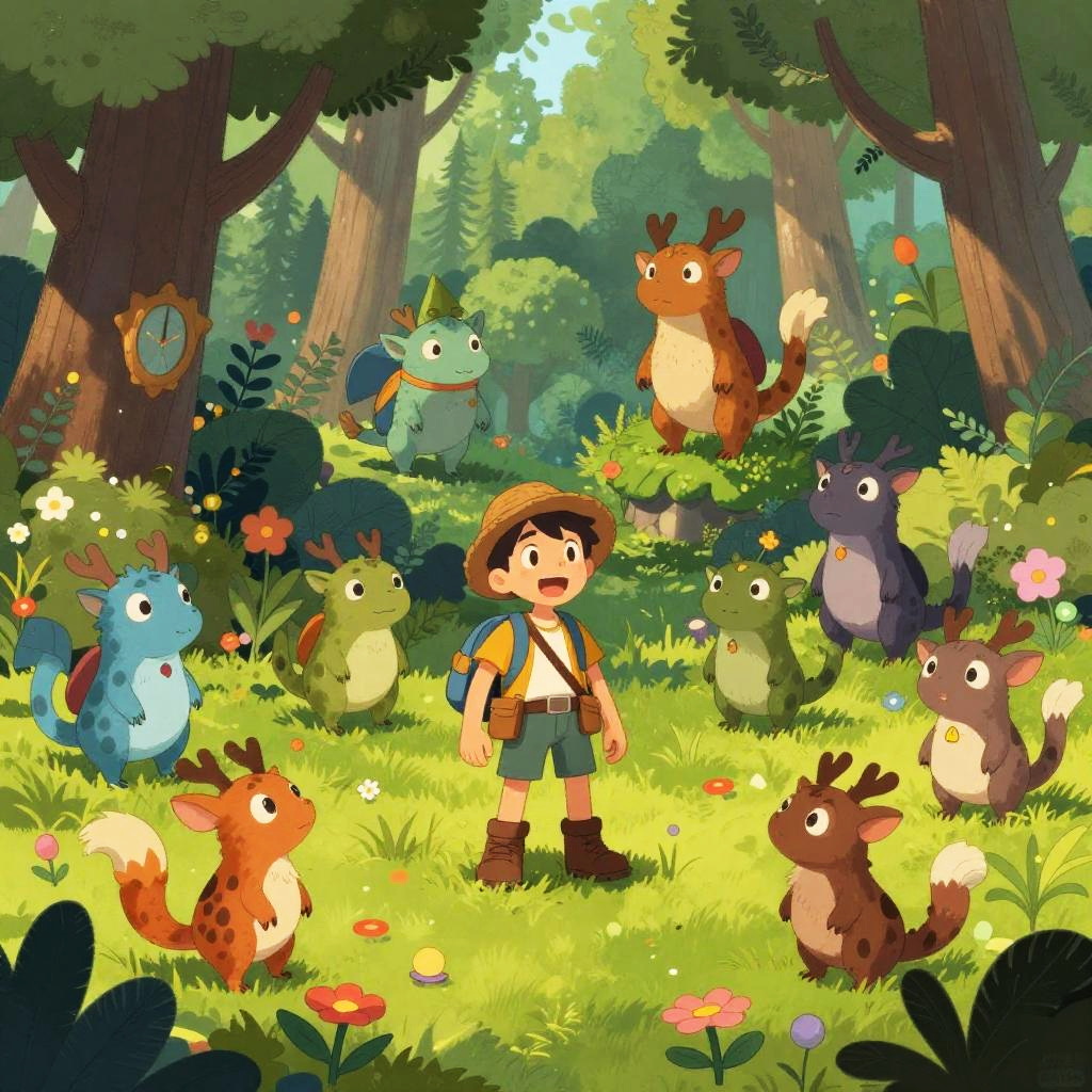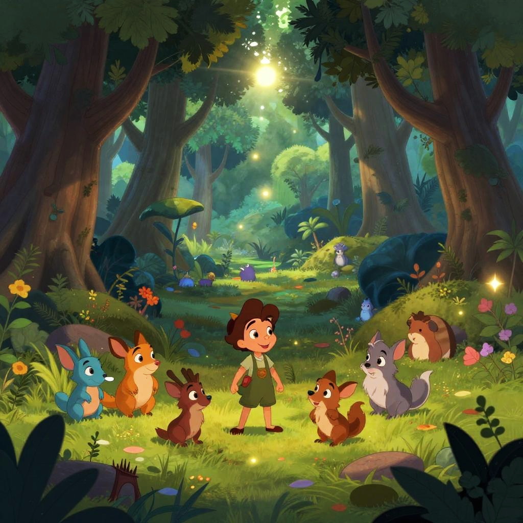 Comic prompt of a whimsical fantasy forest inhabited by magical creatures and adventurers, rendered in bright, playful colors with detailed textures and imaginative designs, capturing a sense of wonder and excitement.