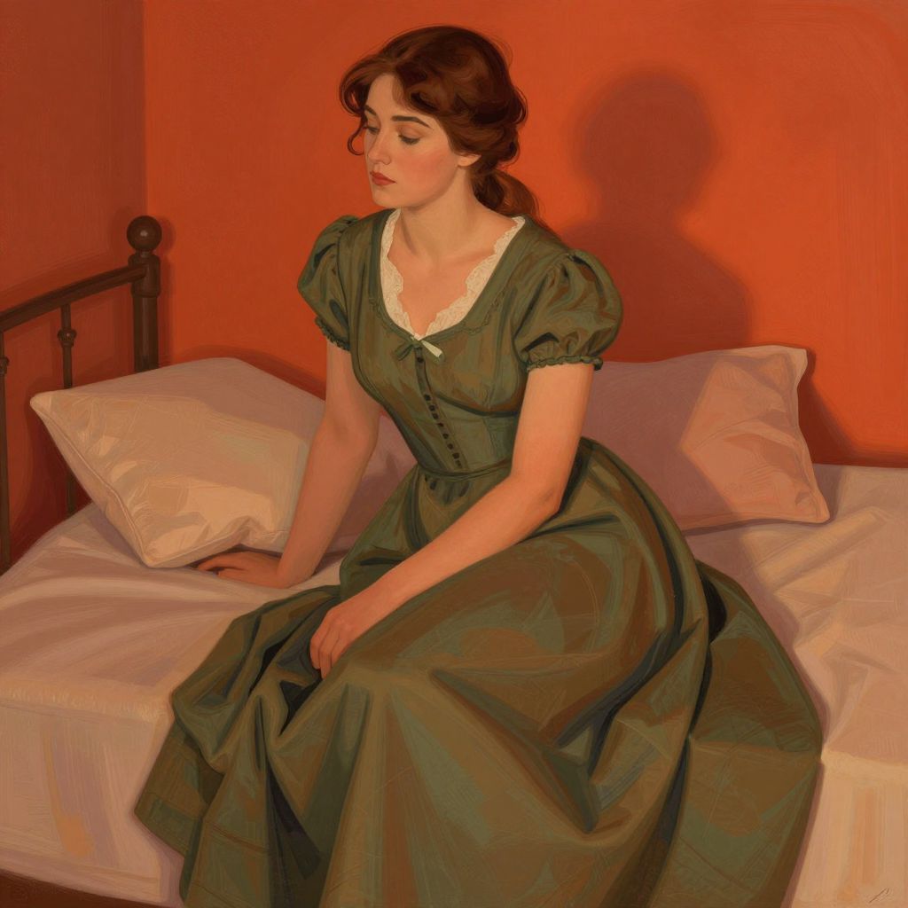 This digital painting depicts a young woman with fair skin and dark brown, wavy hair sitting on a white bed with plush pillows against an orange wall. She wears a dark green, Victorian-style dress with puffed short sleeves and a white lace-trimmed neckline, buttoned down the front. Her gaze is downward, and she rests her right hand on the bed while her left hand holds the skirt of her dress. The bed has a simple, dark metal headboard. The warm orange wall casts a shadow of her head and upper body to the right. The overall style is realistic with a slightly painterly texture.
