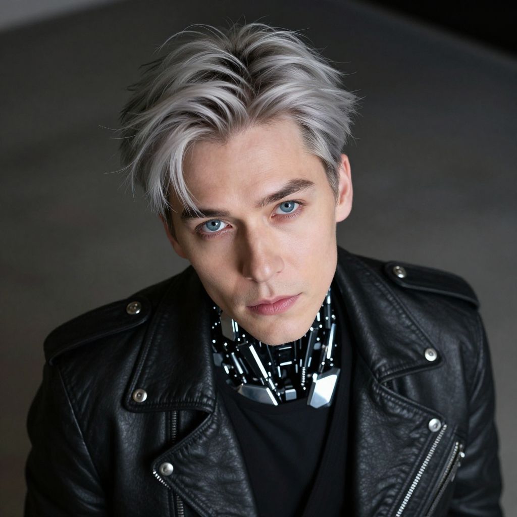 Photograph of a young man with silver hair, blue eyes, wearing a black leather jacket, silver chain necklace, and black shirt, looking up with