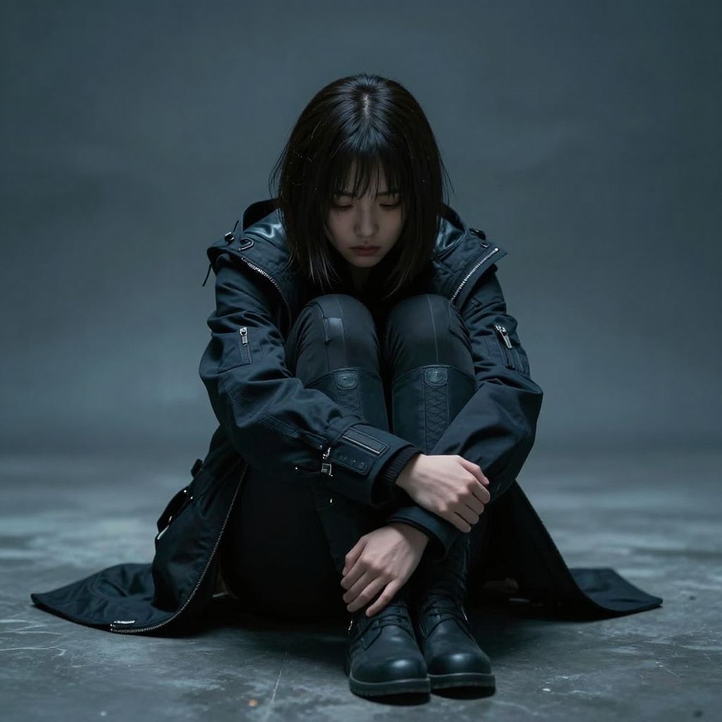 Photograph of a young Asian woman with straight, black hair sitting on a concrete floor against a dark, gradient blue background. She is dressed in a black, long, military-style coat with silver zippers, black jeans, and black boots. Her posture is slouched and she is hugging her knees with her arms, looking down with a somber expression. The lighting is cool and moody, highlighting the texture of her coat and the worn floor. The overall style is dramatic and introspective.