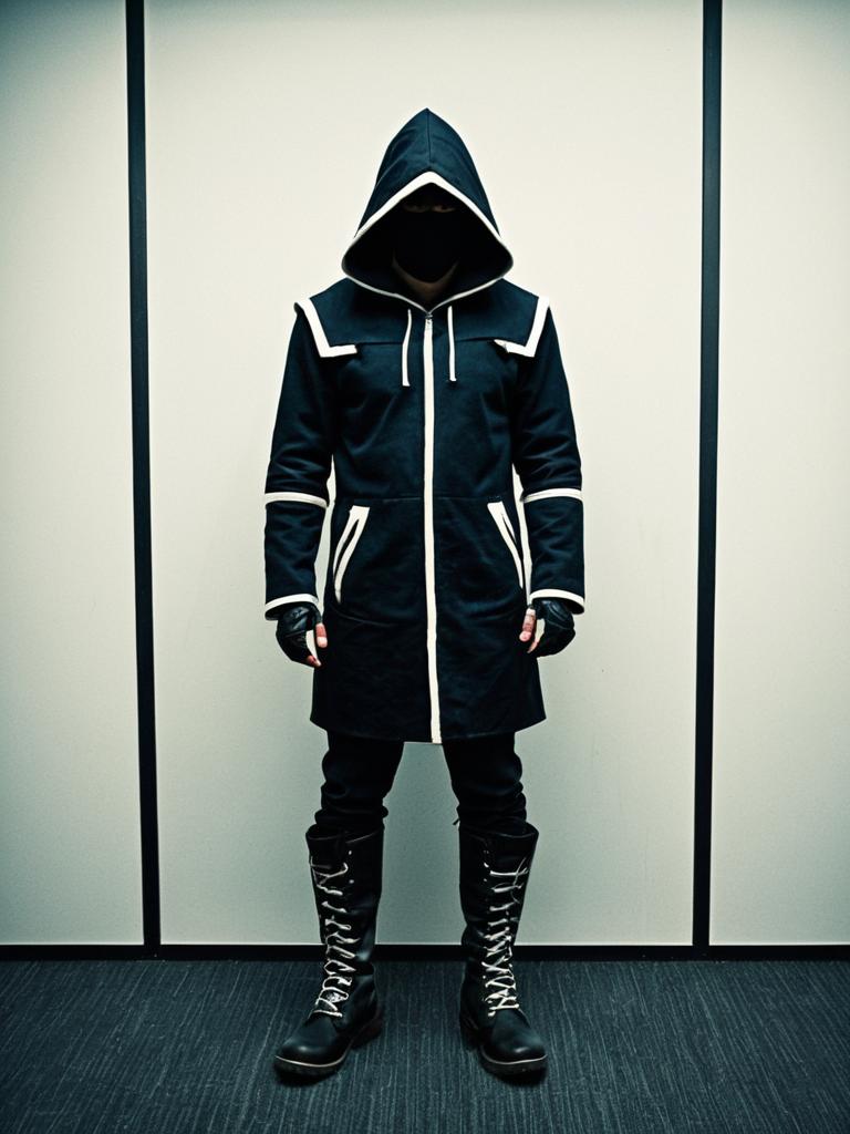 Littlewoods costume, solo, parody, standing, full body, cosplay, looking at viewer, male focus, boots, hood, realistic, closed mouth
