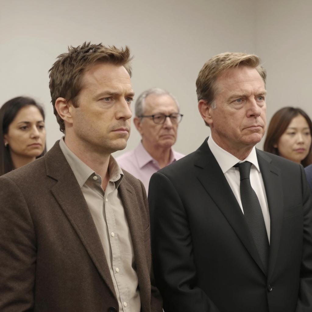 Two men in an office. The man in the foreground wears a gray plaid suit, white shirt, brown tie, and has slicked-back hair. He has a serious expression. The man in the background wears a black suit, white shirt, black tie, and has short gray hair. He looks to the side with a concerned expression. Poster with a yellow car and "New York" is on the wall. Beige walls, gray door, and window with blinds on the left.