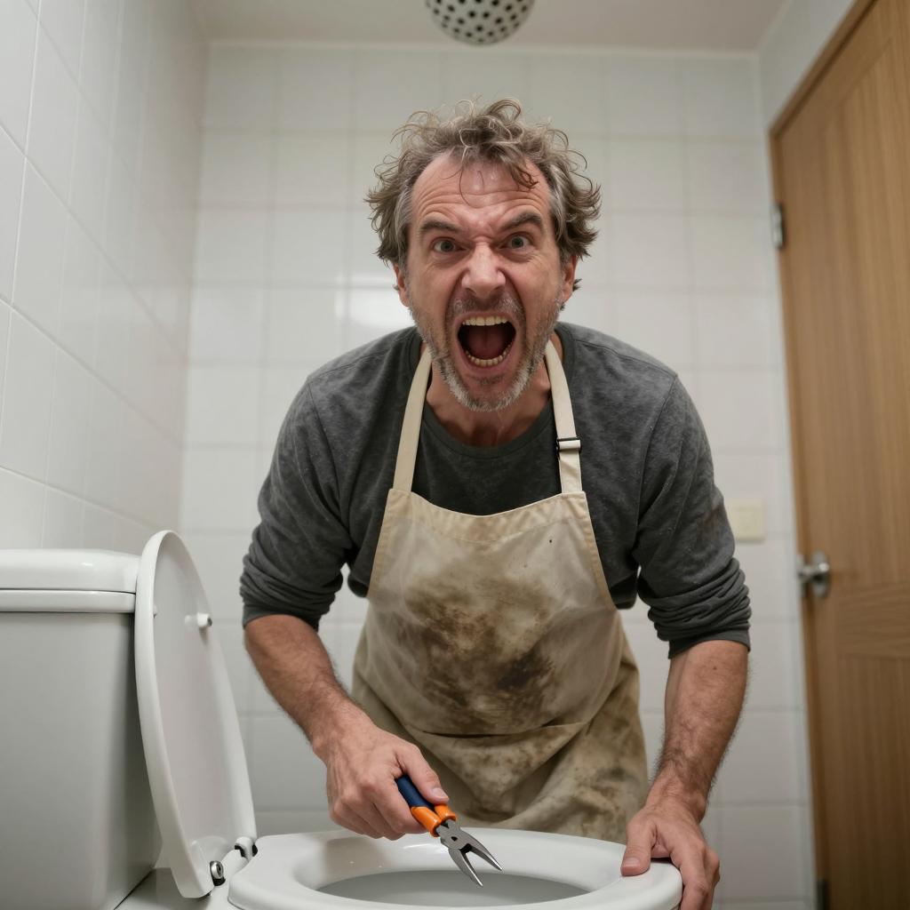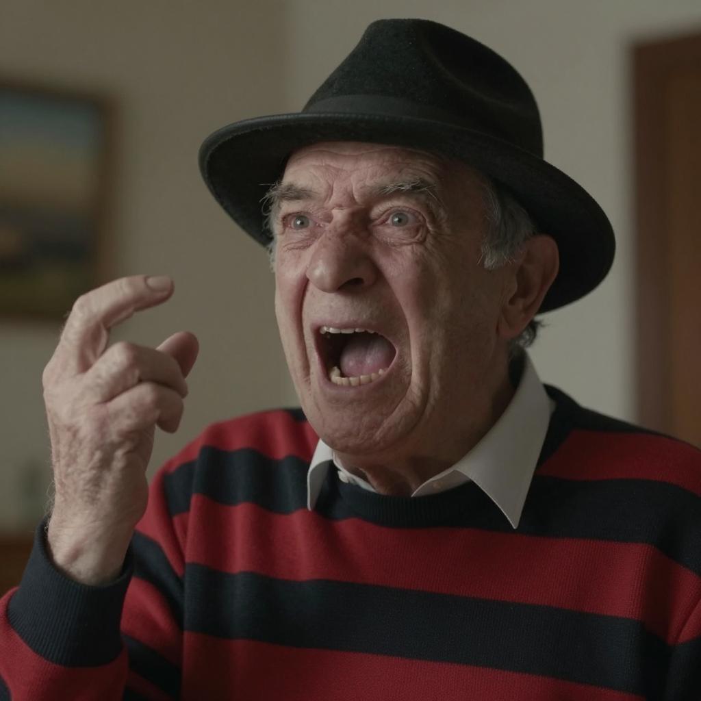 An elderly man with disheveled gray hair, wearing a dirty beige shirt, aggressively claws at a wooden window frame with both hands. His mouth is open wide in a fierce yell. The background is dark blue with a faintly visible window and some greenery. The man's face is intense and expressive. Nighttime setting.