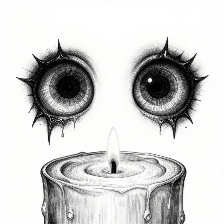 Black-and-white digital drawing of a dripping candle with large, spiky, horror-style eyes above it, creating a creepy, eerie atmosphere.
