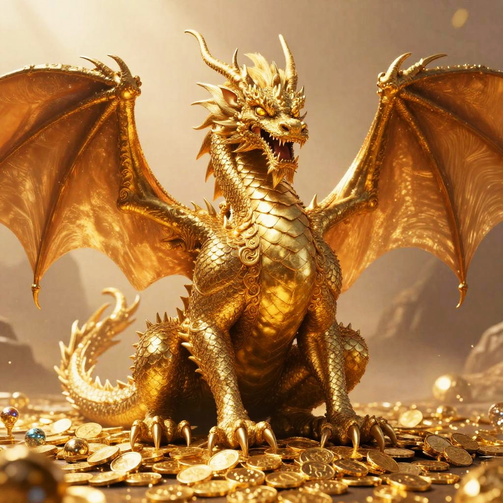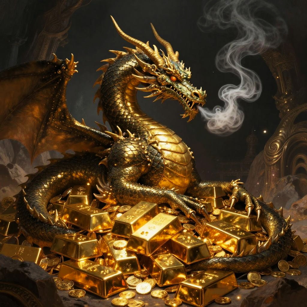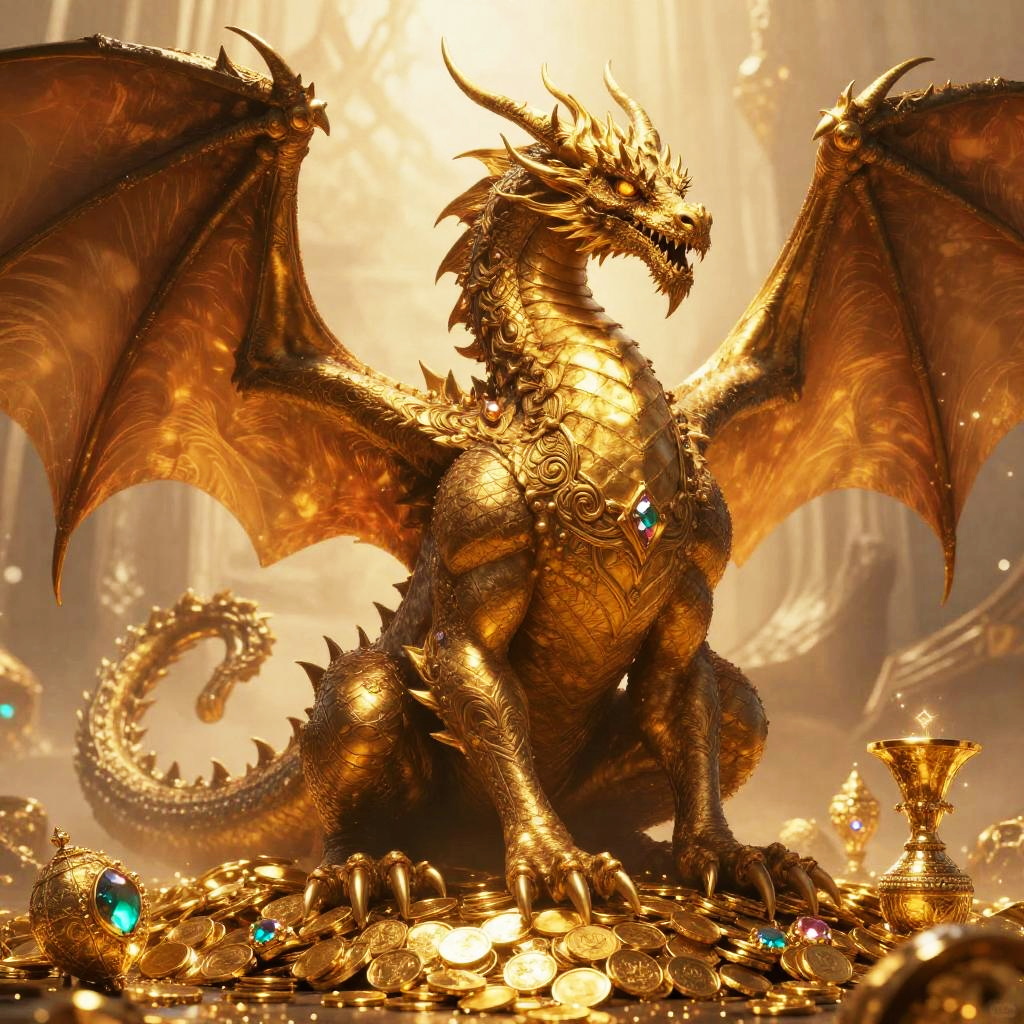 A fearsome dragon sitting on a throne made from gold and treasure, fiery eyes glowing, dramatic shadows casting over glistening gold piles, fantasy epic scene, detailed scales and treasure reflections, mystical cave environment with ancient runes