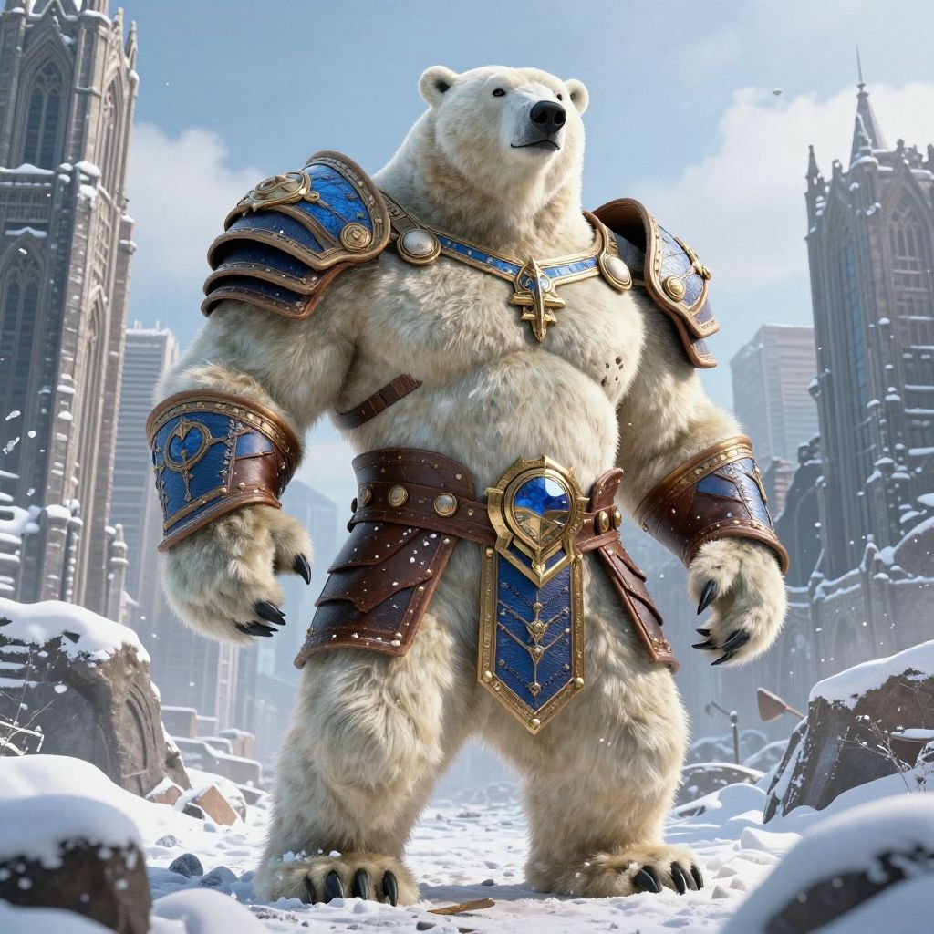 A massive, muscular polar bear titan with a bodybuilder physique wearing ornate leather armor detailed with blue and gold elements. The photorealistic, ultra-detailed image shows the towering beast standing in a snow-covered, war-torn cityscape with tall, Gothic-style buildings. The scene evokes power and epic fantasy battle themes, rendered with advanced 3D technology.