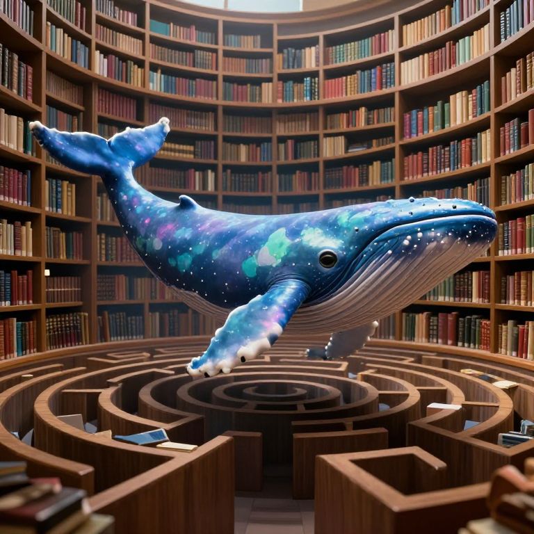 In a labyrinthine library where knowledge stretches endlessly, a technicolor whale drifts serenely, its vibrant scales whispering stories of boundless curiosity and the profound connection between memory and imagination.