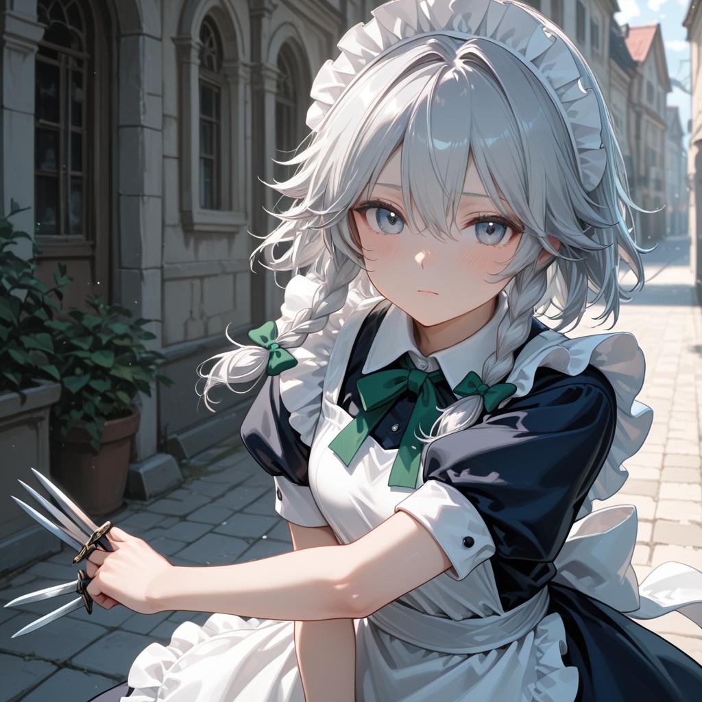 1girl, izayoi sakuya, touhou, solo, maid headdress, maid, apron, short sleeves, dress, closed mouth, white apron, looking at viewer, maid apron, puffy short sleeves, frills, puffy sleeves, black dress, frilled apron, hair between eyes, outdoors, blush, throwing knives, knives, serious face, upper body, masterpiece, best quality, very aesthetic, absurdres