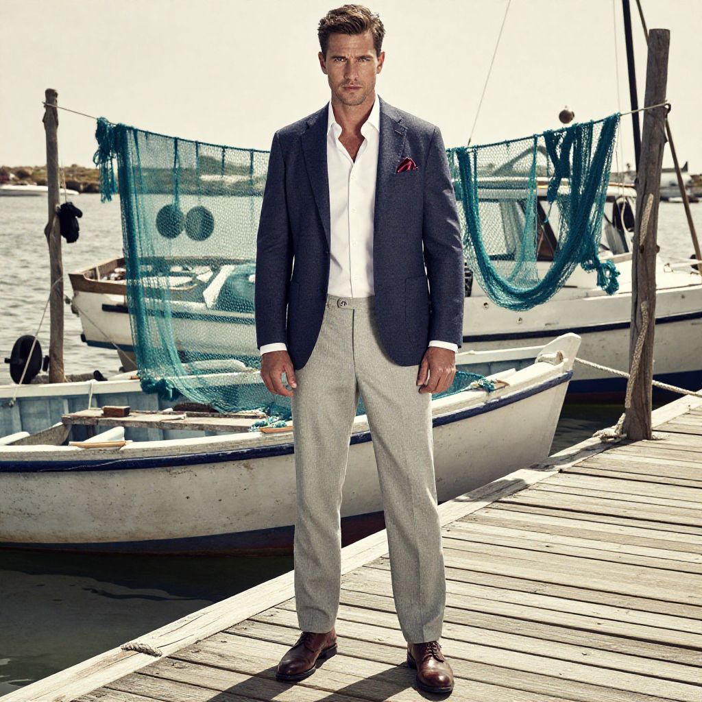 Photograph of a handsome man in a navy blazer, white shirt, and beige pants standing on a wooden dock with fishing nets and boats in the