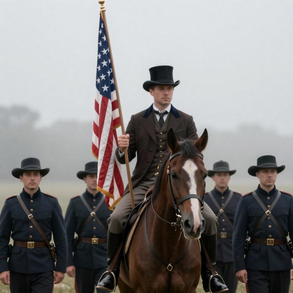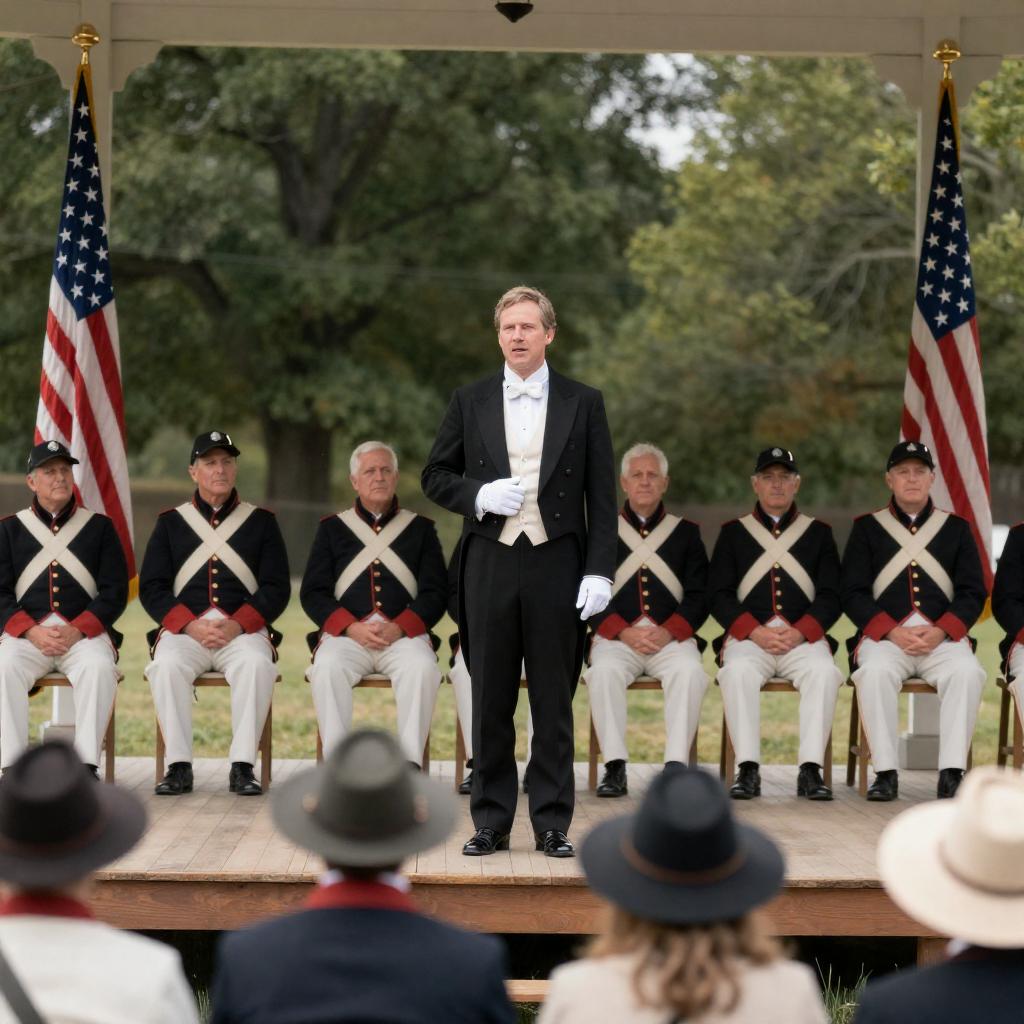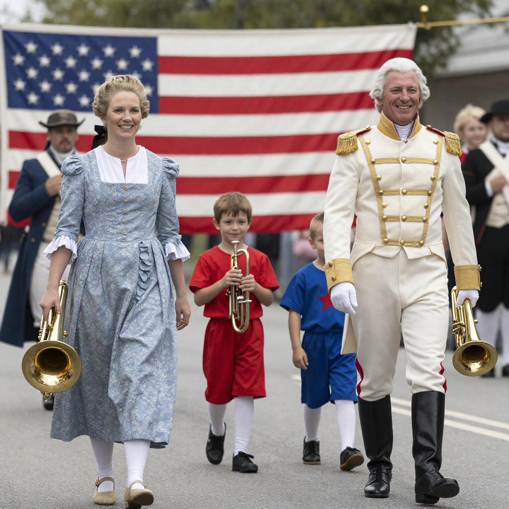Photograph of a parade with four people in historical costumes. Two adults in 18th-century attire, one in a blue floral dress, one in a white and gold military uniform, and two children. The children wear red and blue patriotic outfits. Brass instruments and a banner with stars and stripes in the background. Smiling and cheerful expressions.