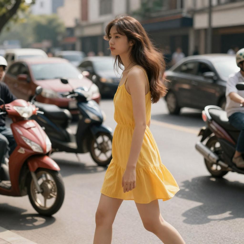 Young woman with long brown hair, wearing a yellow sleeveless dress, walking through a busy urban street. Motorcycles and cars in the background, sunlight casting shadows. She looks slightly to the side, mid-motion. Background buildings and overpass visible.