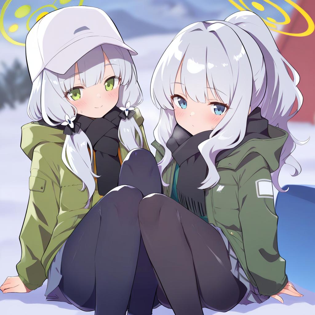Digital illustration of two anime-style girls outdoors in a snowy setting. Both characters have light grey hair and are dressed in green hooded jackets, black scarves, and black pantyhose. The girl in the foreground wears a white hat with a green halo above her head, has blue eyes, and long hair tied with a flower accessory. The girl behind has golden-green eyes and her hair styled in a ponytail.