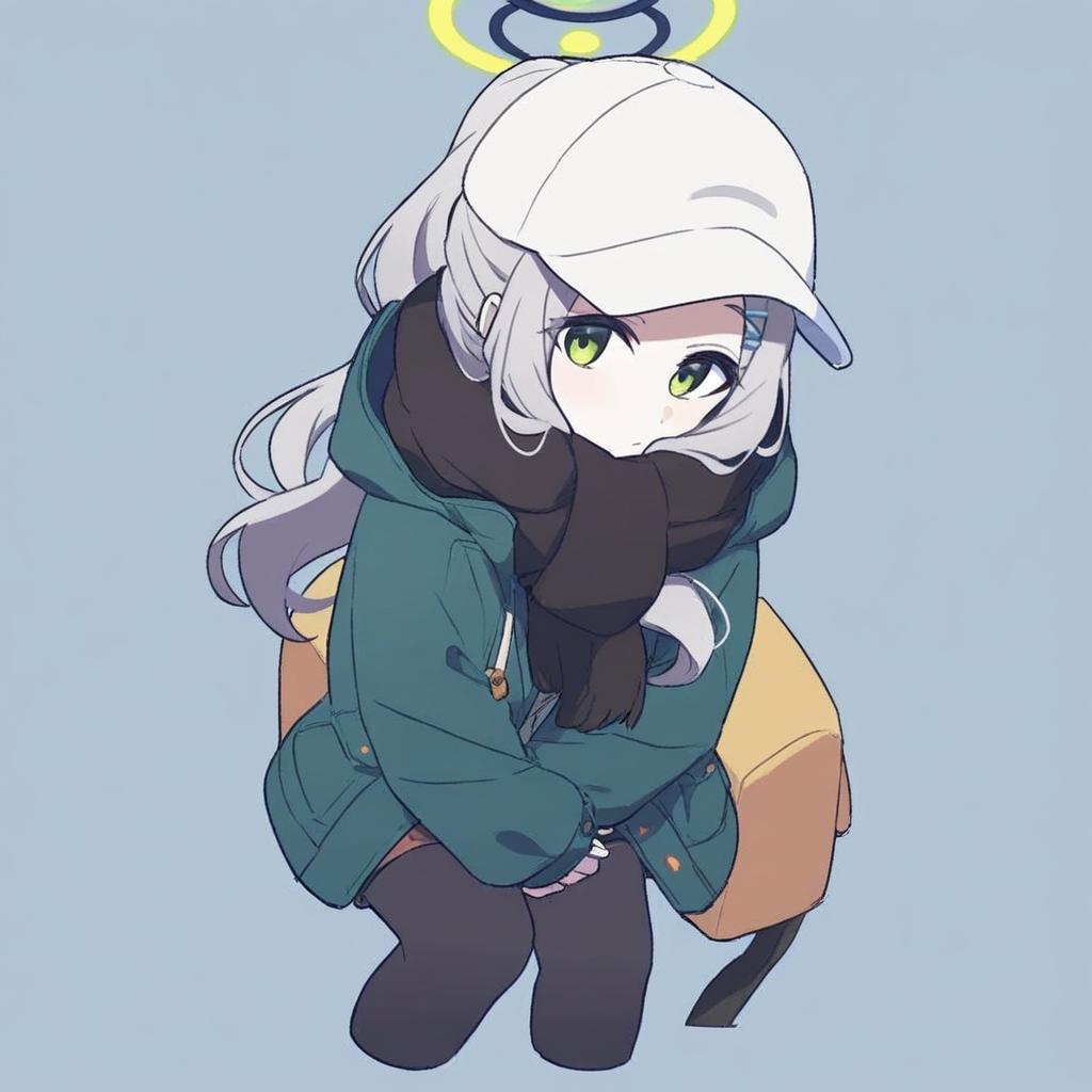 Hare (camp) (blue archive), blue archive, 1girl, green eyes, long hair, grey hair, ponytail, green jacket, white headwear, hooded jacket, open jacket, black scarf, hat, black pantyhose, halo, green halo, long sleeves, hood down, white hat, by artist akira (coffee curry), illustrious