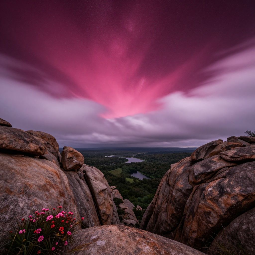 Random perspective, f/4.5, <8k, high detail, uhd, sharp focus, palette, photorealistic, absurdres, extreme detail, as much detail as possible, extremely high visibility>, dark pink, matte purple, dark beige, dark white, shiny red, (a mesmerizing scenery of clouds and stars showing a natural landscape:1.3), celestial objects in a beautiful sky, boulders, flowers, ravine, nature, shooting stars, beautiful earth, deep forest, shrubland, oasis, night, (rain:0.5), the most beautiful image in the world