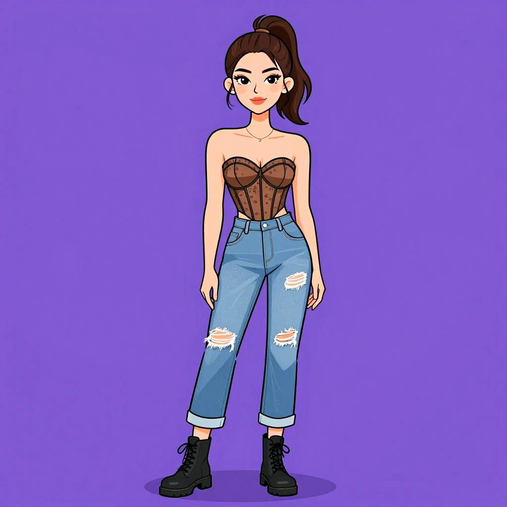 Digital illustration of a young woman with fair skin and dark brown hair in a high ponytail, standing against a solid purple background. She wears a strapless, brown corset with lace detailing, blue, high-waisted, ripped jeans with white patches on the knees, and black, lace-up ankle boots. Her lips are red, and she has a confident expression with a slight smile. She stands with her arms relaxed by her sides. The style is bold and colorful, reminiscent of contemporary comic art.