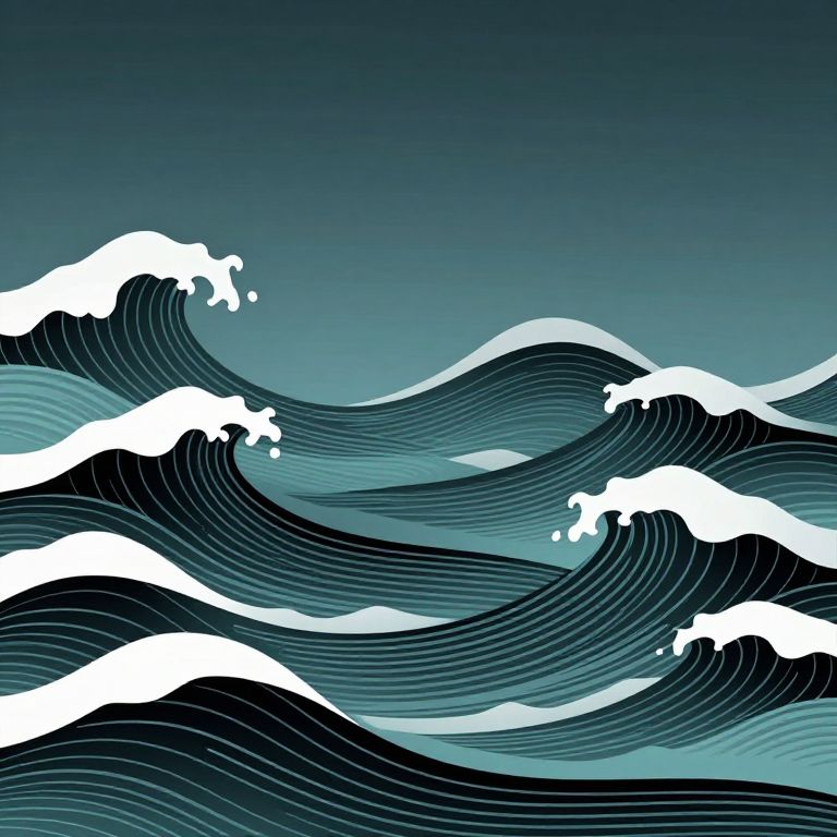 The image presents a striking minimalistic art piece featuring waves. The composition is dominated by a series of undulating, wave-like forms that create a sense of movement and depth. The waves are rendered in a palette of cool, muted tones, primarily shades of teal and black, with occasional white highlights that accentuate the peaks and troughs. The waves are arranged in a dynamic pattern, with some appearing closer to the viewer and others receding into the background, creating a sense of perspective. The overall effect is one of fluidity and motion, as if the waves are captured in mid-flow. The background is a gradient of dark teal, which contrasts with the lighter tones of the waves, further emphasizing their form and movement. The interplay of colors and the intricate detailing of the waves' textures add to the visual richness of the image, making it a captivating representation of the natural phenomenon of waves.