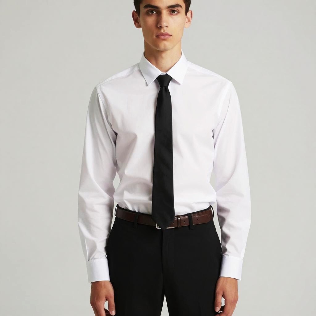 A young man stands confidently against a plain background wearing a white dress shirt paired with black pants and a loosely worn black tie. His style is simple yet elegant, featuring a brown belt that adds a touch of contrast to his formal outfit. The focused expression on his face highlights a modern, minimalistic fashion aesthetic.