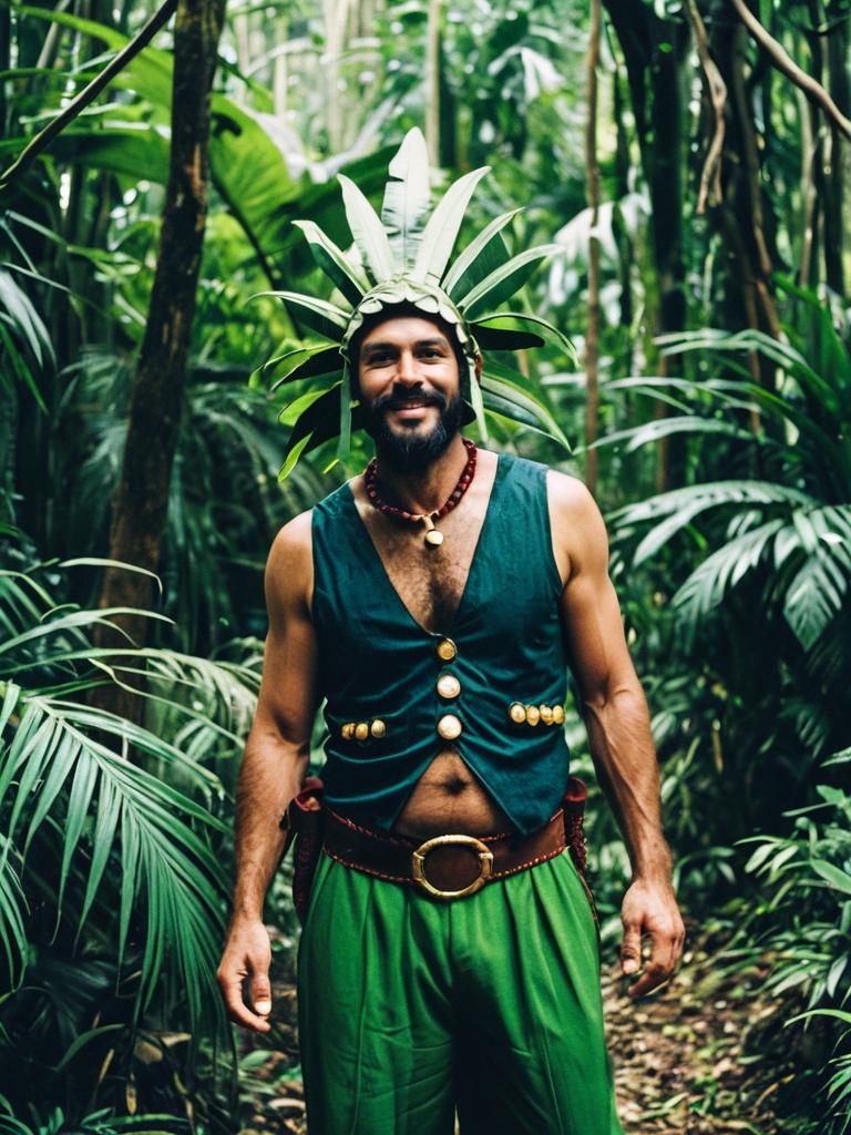 Smiling man wearing a green vest with gold buttons, green pants, and a unique headdress made of large green leaves, standing in a dense jungle environment. The photo captures a humorous and cinematic style cosplay or fancy dress costume with tropical foliage in the background.