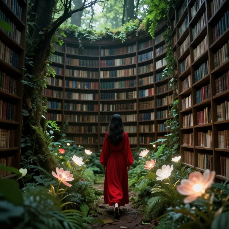 In a dreamlike library where bookshelves seamlessly blend with a verdant forest, a figure in a crimson gown walks amidst spectral flowers that seem to pulse with an otherworldly light, defying the boundaries between knowledge and nature.