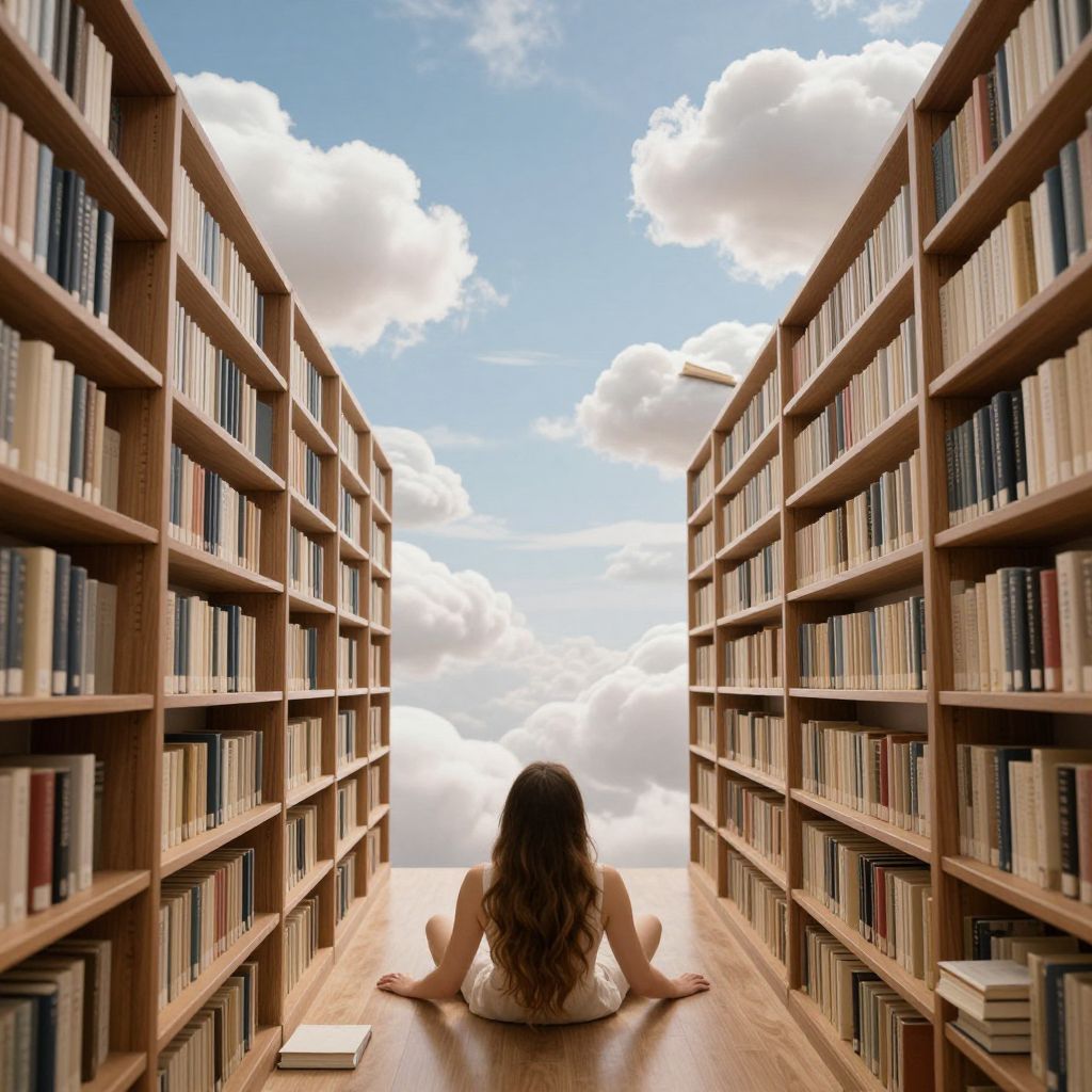 Dreamlike Forest Library with Crimson Figure