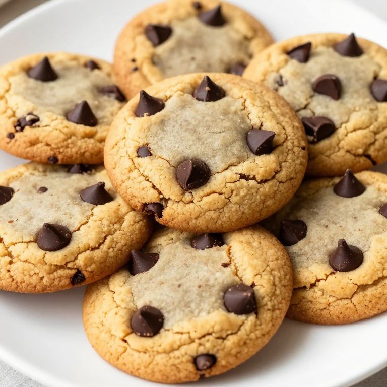 Golden-brown chocolate chip cookies, generously studded with dark chocolate chips, are piled invitingly on a white plate, showcasing their soft, chewy texture and slightly cracked surfaces.
