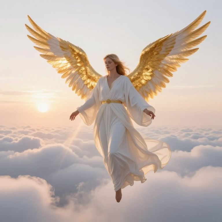 A serene angelic figure with flowing white robes and radiant golden wings floating above peaceful clouds at sunrise. The image features soft pastel colors, radiant light beams, and intricate feather details, creating a spiritual and calming ambiance.