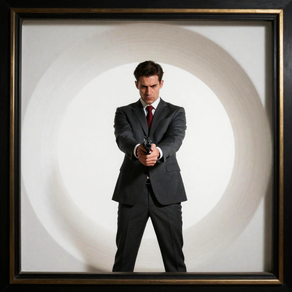 A man wearing a dark gray suit and red tie stands inside a circular tunnel with a white background. He holds a black handgun with both hands, aiming forward with an intense and focused expression. The tunnel features a subtle swirling pattern and is framed in a black frame lined with gold.