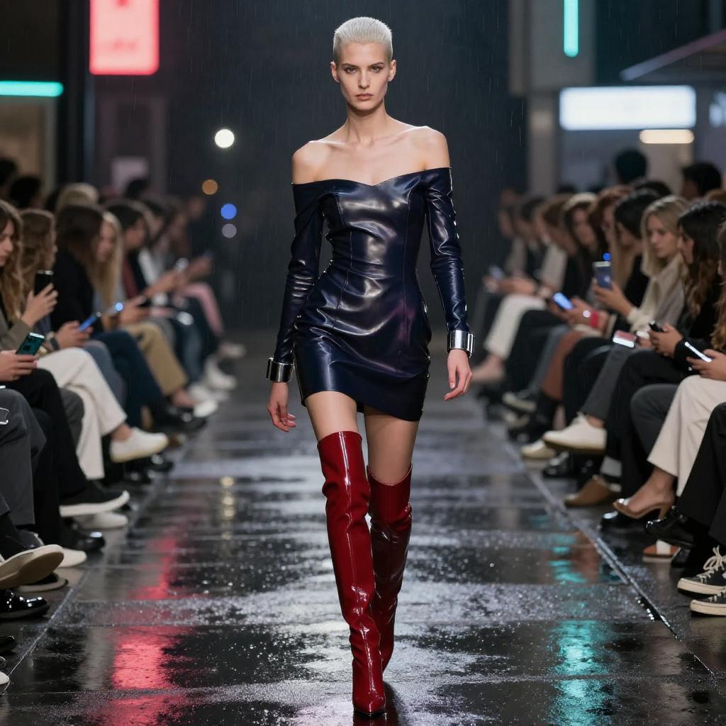 Image in the style of Minimalist Scandinavian Fashion Editorial, sophisticated DJ, platinum buzzcut, tall, lean musician physique, (Leather & Latex Off-Shoulder Dress:1.3), matte black leather off-shoulder dress with integrated latex paneling, charcoal thigh-high latex boots, minimalist silver headphones, pale oak studio with diffuse natural light and soft shadow studio background