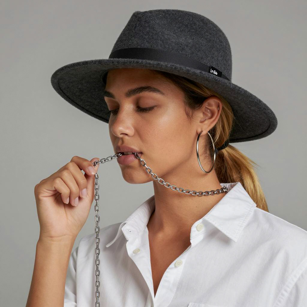 Photograph of a woman with light skin, wearing a large black wide-brimmed hat, covering her eyes. She has full lips, gold hoop earrings, a gold chain necklace, a gold ring, and a gold bracelet on her right arm. She is topless, with her right hand touching the brim of her hat. The background is a plain, light-colored wall. Her facial expression is neutral.