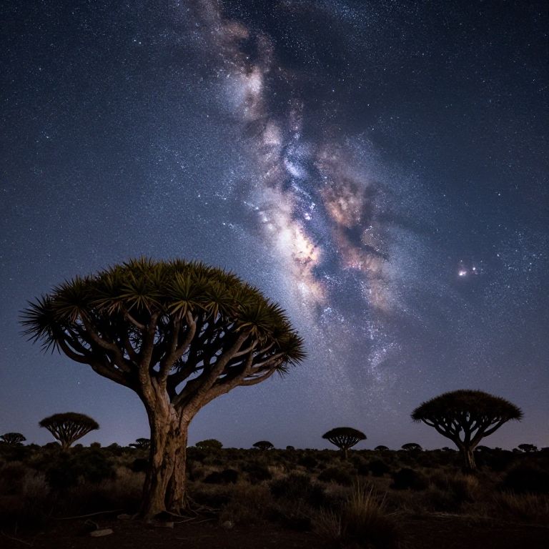 Photograph of a night sky showcasing the Milky Way galaxy in vivid detail. A cluster of star-filled sky dominates, with bright white and blue stars scattered across. In the foreground, three acacia trees with spiky, umbrella-like canopies stand silhouetted against the starry sky. The trees are dark and shadowy, set against a gradually lighter horizon. The landscape below is a dark, rocky terrain with sparse vegetation. The overall scene blends the natural beauty of the African savanna with the awe-inspiring vastness of the cosmos.