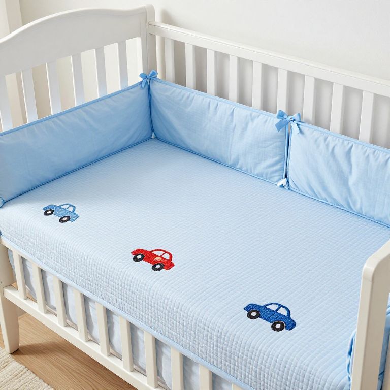 Blue-themed baby crib bedding set featuring stereo embroidery of cars, including a quilt, fitted sheet, and bumper pads, arranged neatly in a white wooden crib with decorative bows.