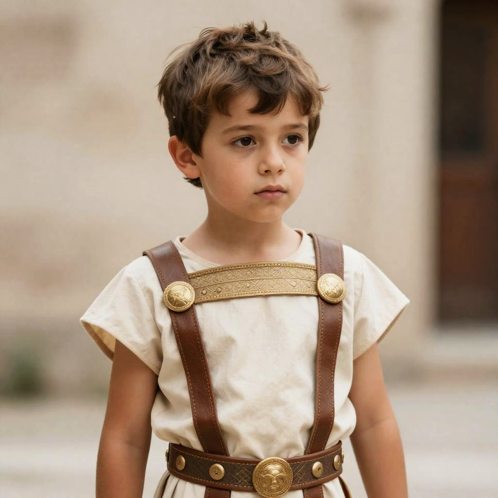 Close-up portrait of a young boy wearing an ancient Roman-style costume. The outfit features a beige tunic with brown leather straps and decorative gold buttons, showcasing traditional Roman attire. The boy has short brown hair and a neutral expression, standing against a blurred outdoor background.
