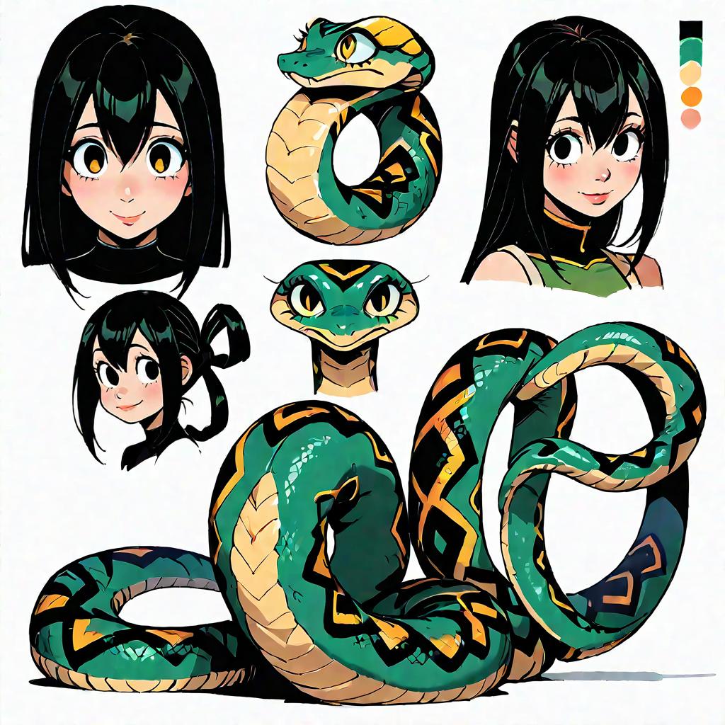 Score_9, score_8_up, score_7_up, score_6_up, score_5_up, score_4_up, tsuyu asui, long hair, black hair, yellow snake eyes, slit pupils, low-tied long hair, hair rings, gloves, bodysuit, green bodysuit, lamia, snake body, green scales, yellow belly, snake body up, tip of the snake body up, titanoboa body, CharacterDesignXL, (CharacterSheet:1), reference sheet, (full body, from side, front:1.1), upper body, cartoon, simple white background