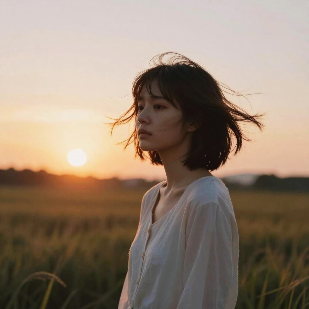 Portrait of a young Asian woman with long dark hair holding a pink rose, standing outdoors at sunset. The image features dramatic volumetric and particle lighting, with green bioluminescent glowing eyes and a soft focus on the delicate rose petals. The background shows a warm orange sun near the horizon, creating a surreal and ethereal atmosphere.
