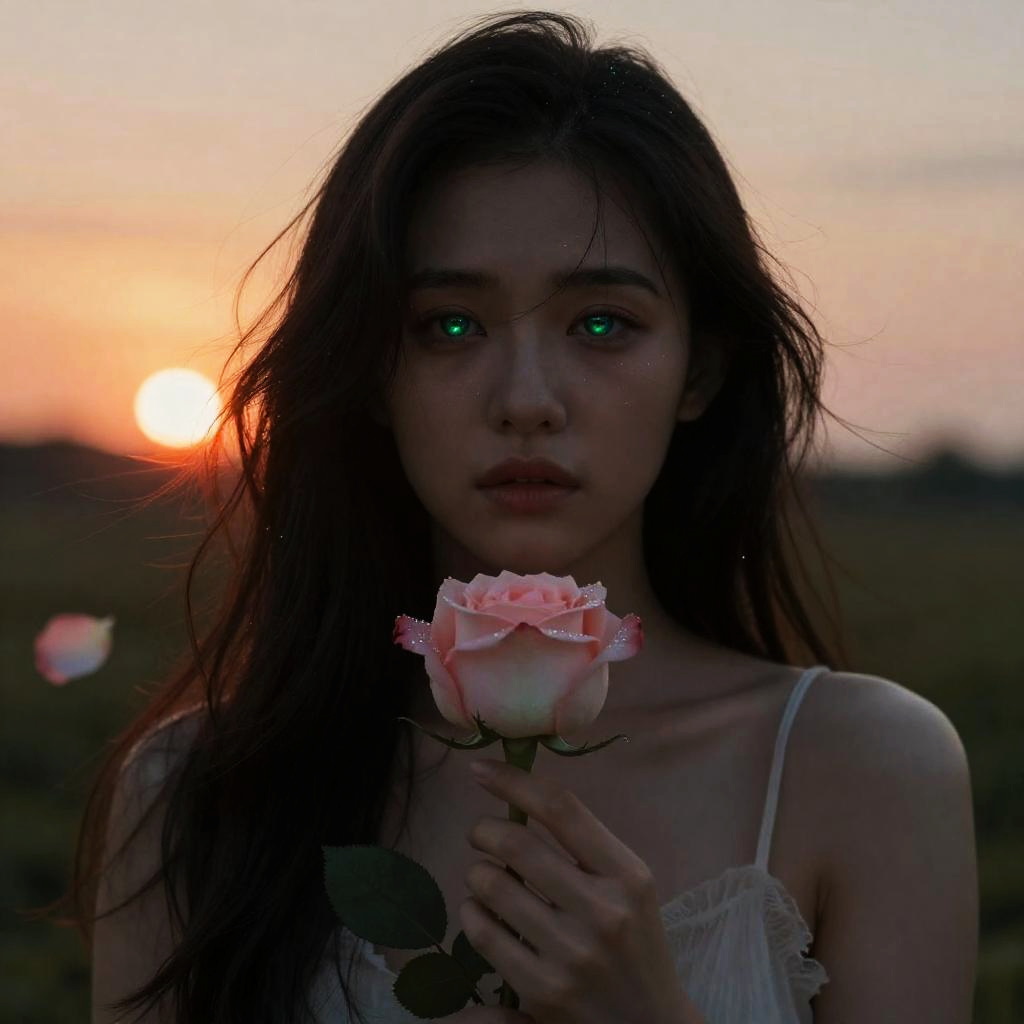 Woman Holding Rose at Sunset with Glowing Green Eyes