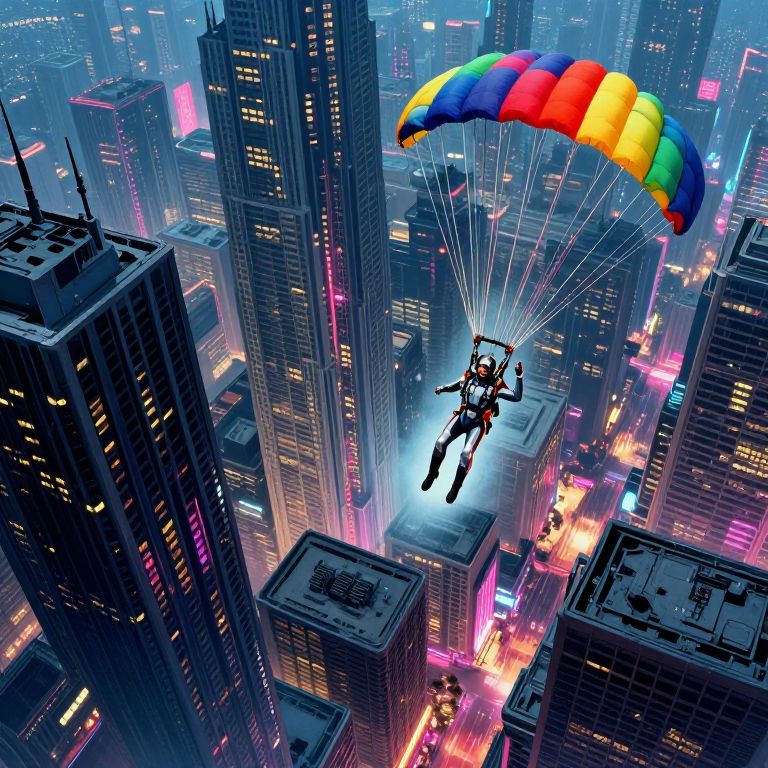 Digital artwork of a person parachuting with a multicolored parachute over a neon-lit, futuristic cityscape of skyscrapers at night.